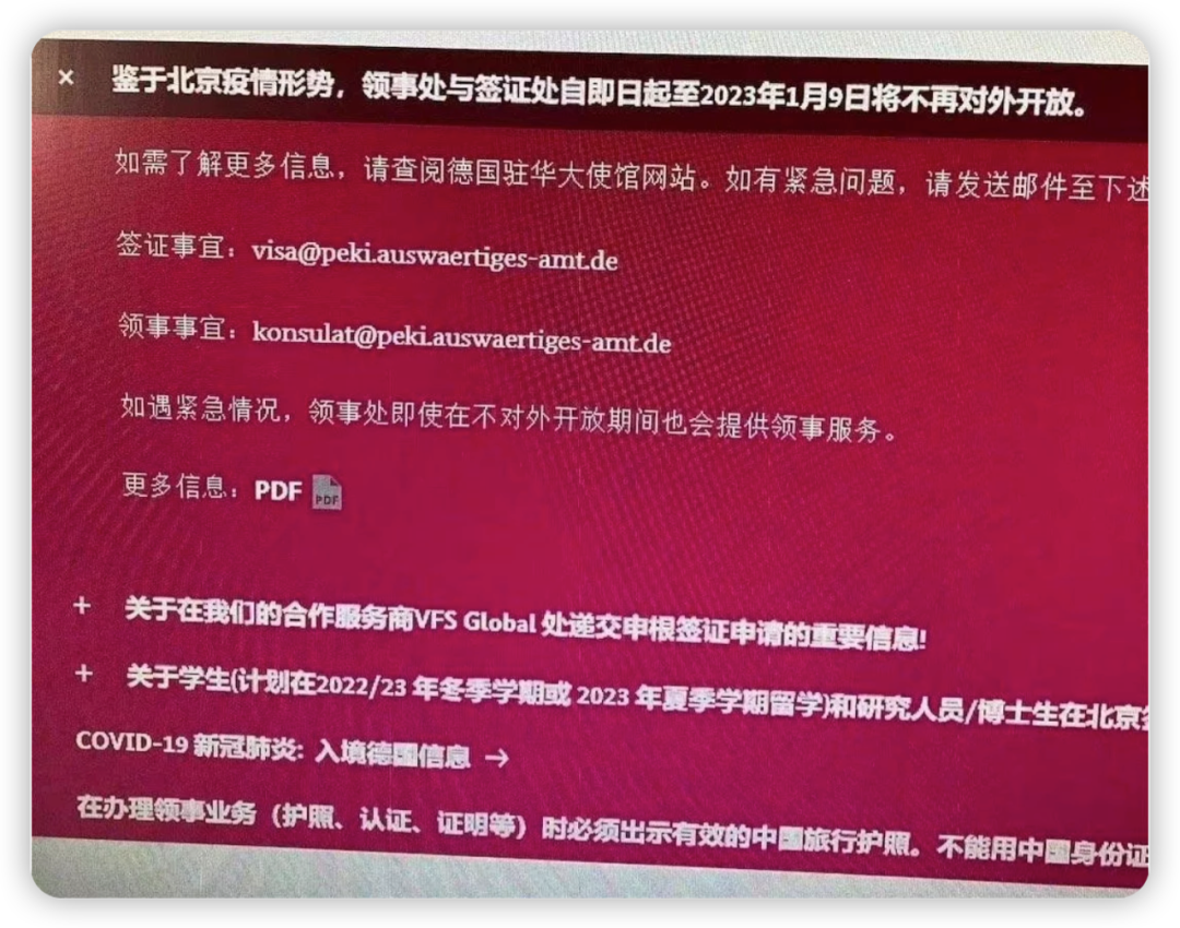 美国才发完通知,紧接着德国的北京签证中心也关闭了。