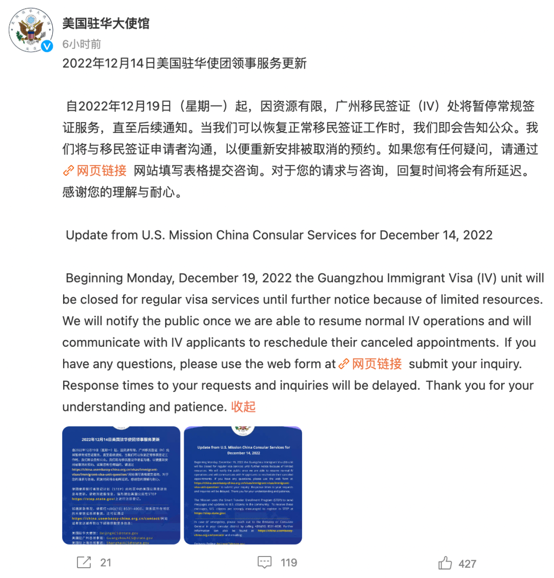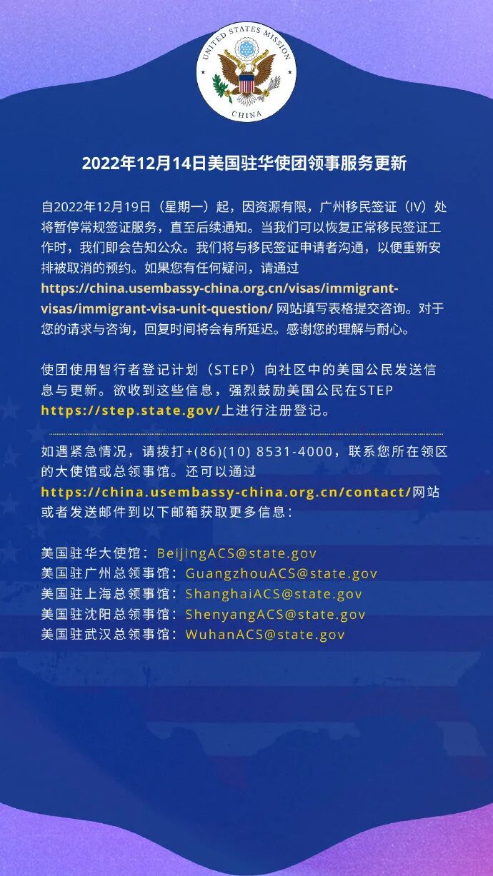 另外,广州领事馆的移民签证处也将从12月19日开始暂停常规签证服务(包括移民签),何时恢复需等待后续通知。