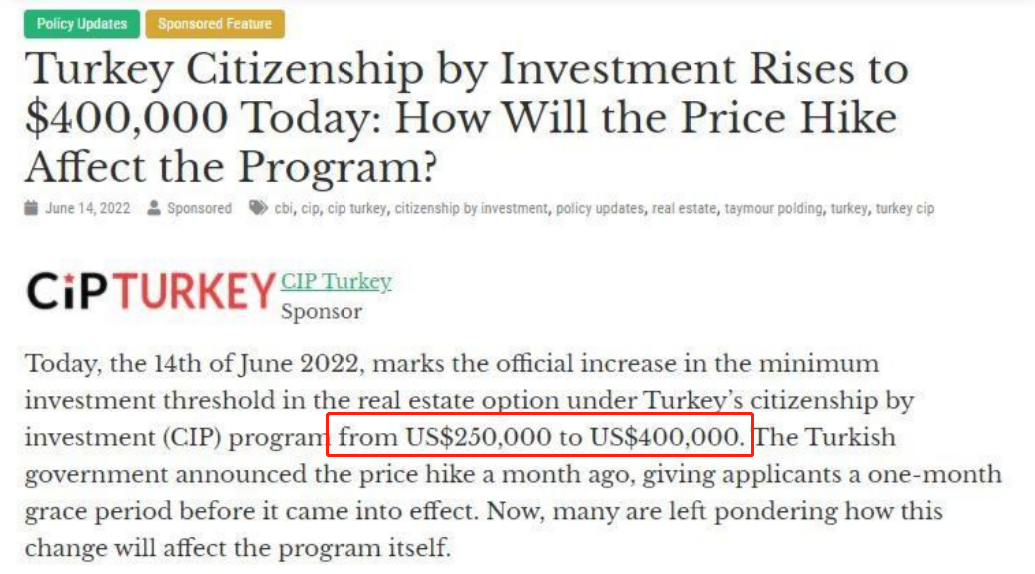2022年6月13日起,购房投资入籍门槛从25万美元提高到40万美元,土耳其投资入籍正式进入40万美元时代。