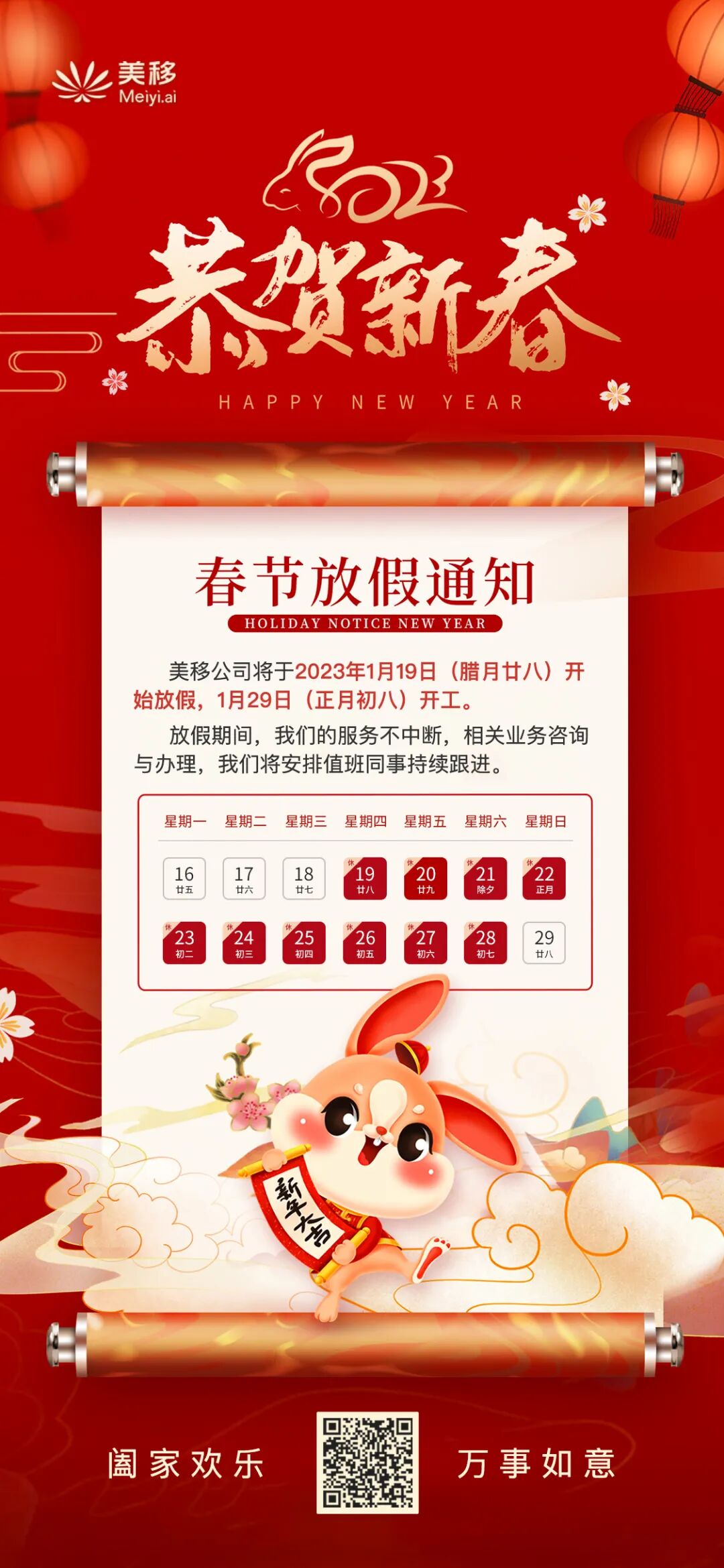 美移移民开始春节假期,1月29日(正月初八)开工,祝新春快乐!