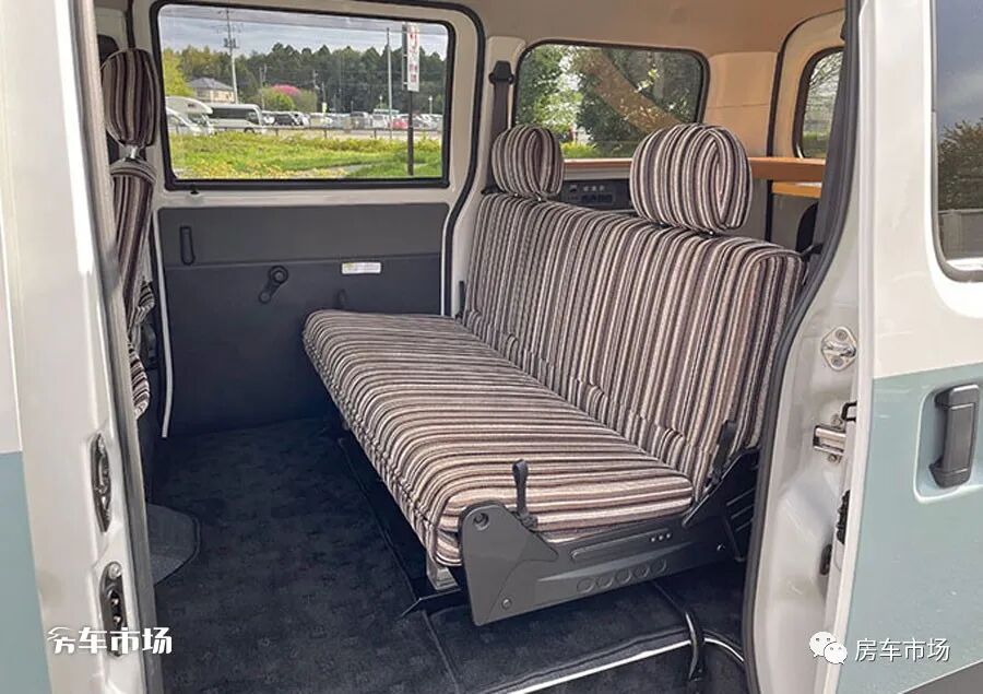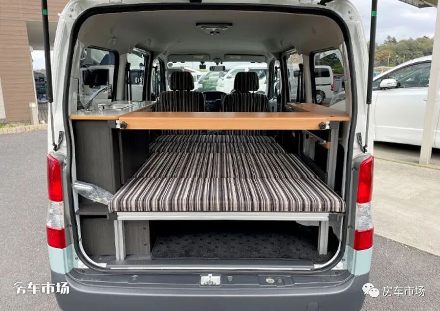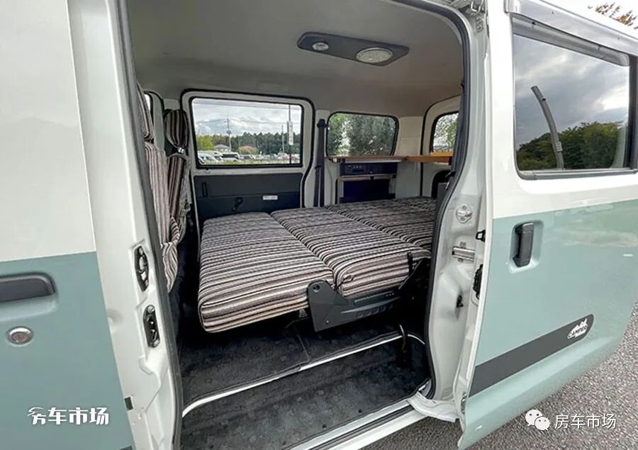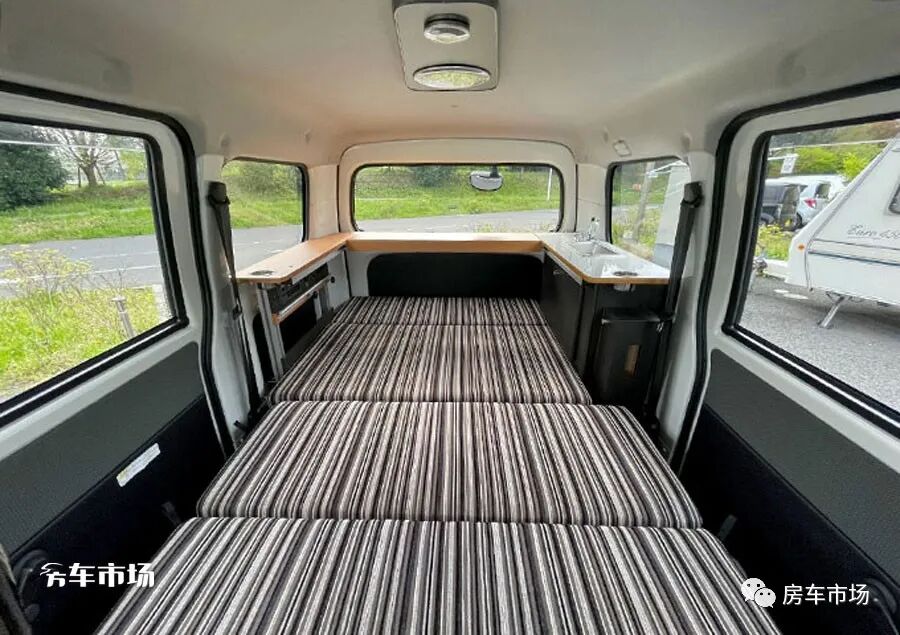 利用空间休息是露营房车的特点,这台车是把所有的座椅放倒,第二排和第三排拼接成一张双人床,尺寸为1.2米*1.7米,床不是很大,临时休息。