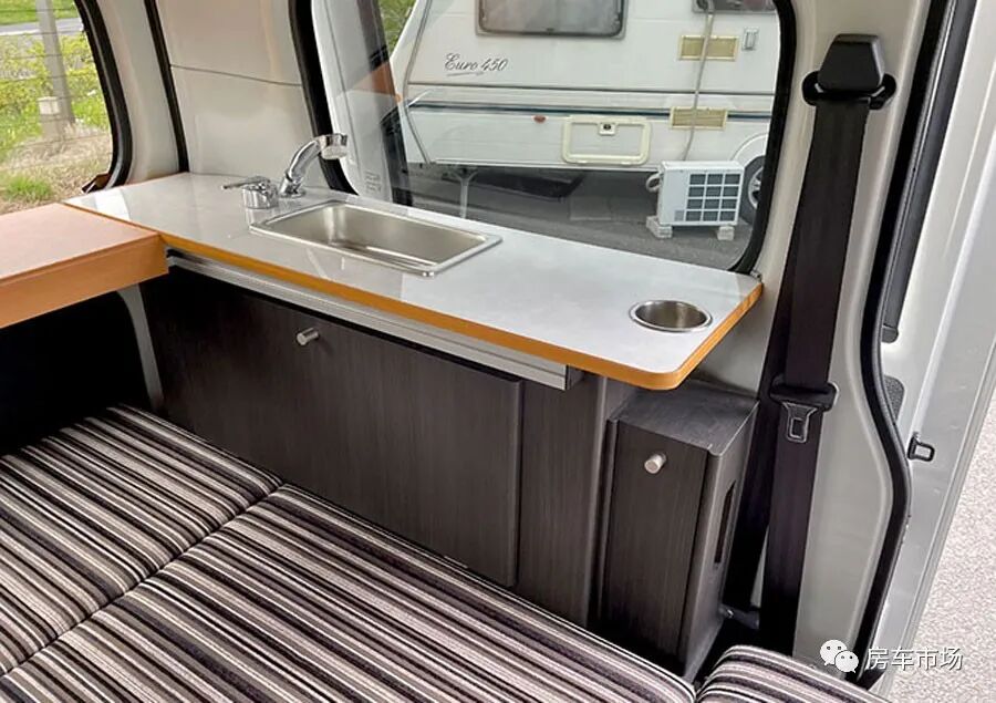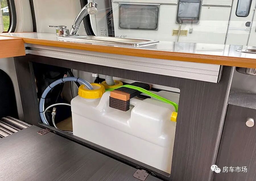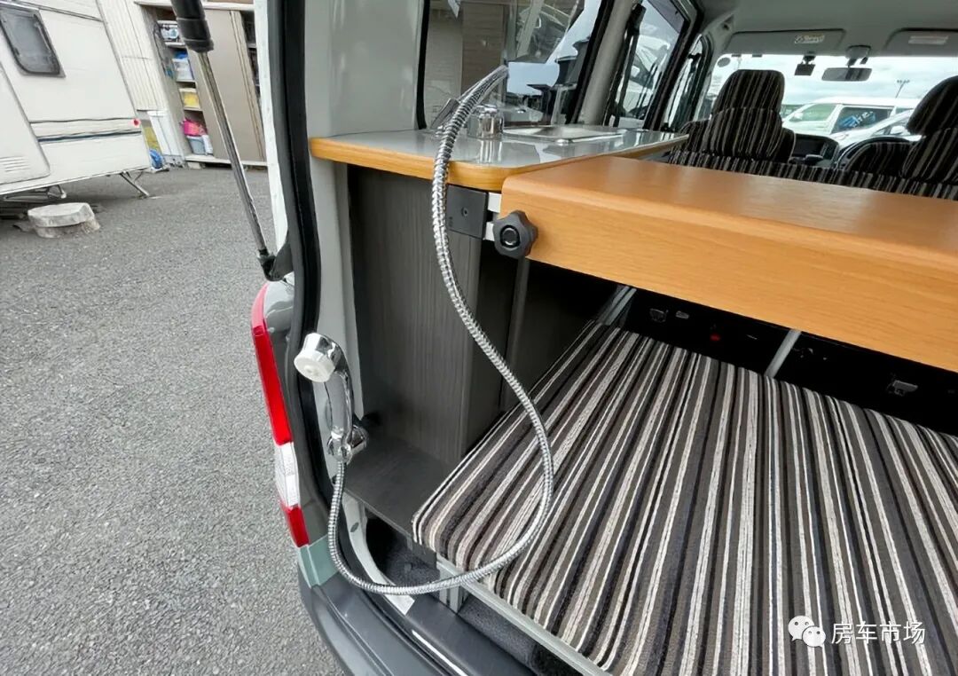 一台能在户外使用的露营房车也要具备很多功能,侧面的桌板都是能利用的空间,放上洗菜盆就能烹饪做饭,水龙头设置成抽拉的就可以简单的冲洗,水箱为两个,清水和灰水各一个12升。