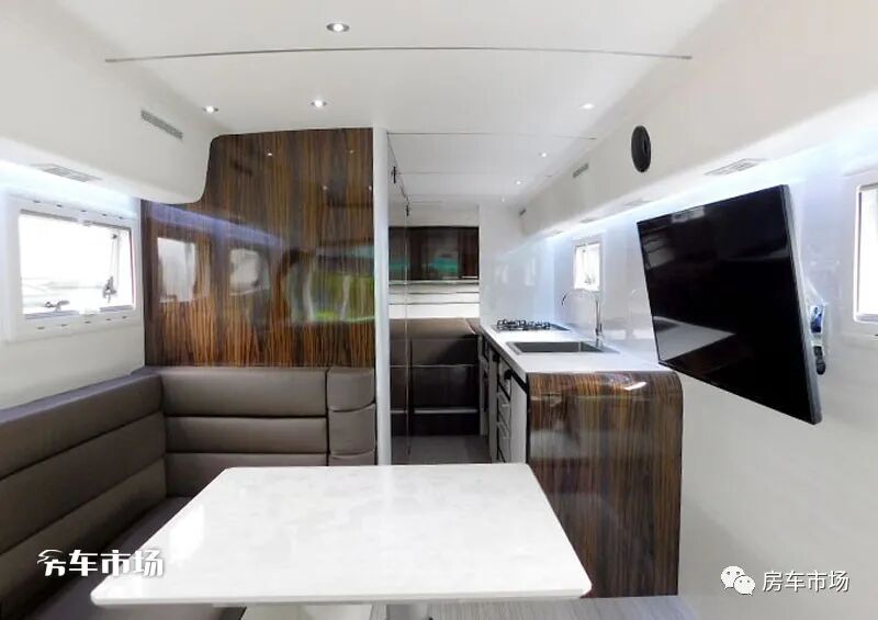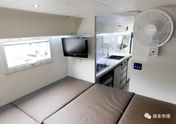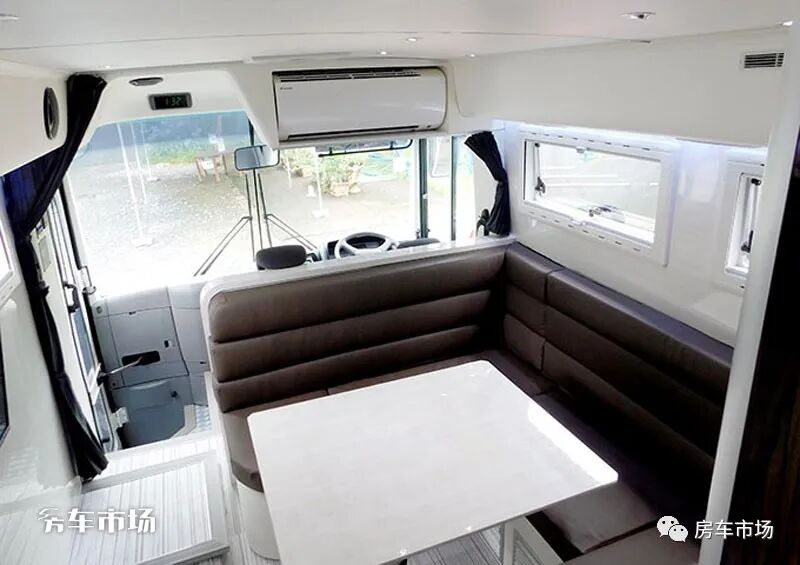 前部的会客区设置的L型皮质沙发,能坐下4人,中间一个方形的桌板可以升降,降下组成一张双人床,周边窗户多透光性好,顶部安装了一部空调,驻车时可以使用。为了提供更多的电量,该车还配备了一台2.8kW发电机,3千瓦的逆变器,2块电瓶。