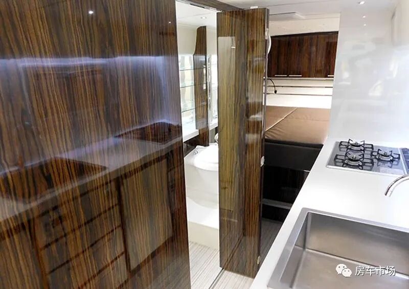 客车上车门一般在前部,进入车内最先看到的是会客区,设置的L型大沙发,往里走就是中部的厨房,占据的空间较大,对面是独立封闭的卫浴间,干湿分离设计,后部就是休息区了,设置的一张双人大床,推拉门设计私密性较好。