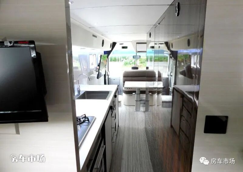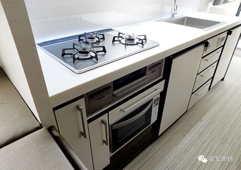 中部的厨房空间较大,台面上设置了3个燃气灶头,并配有两个8kg的液化石油气瓶。旁边是一个不锈钢的洗菜盆,带有冷热水功能的水龙头,燃气热水器提供热水,洗澡洗漱很方便,清水箱150升,灰水箱20升。厨房下面配有微波炉和两个90升的直流车载冰箱,能放置不少物品。