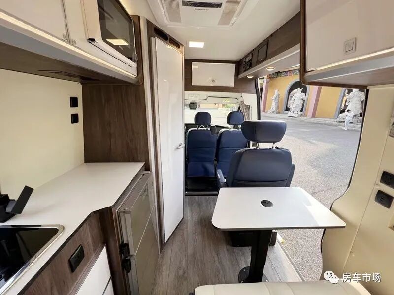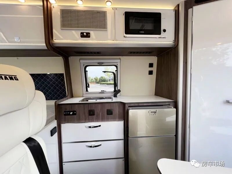 会客区配有三人座,中部有一张升降餐桌,客厅的顶部配有220V顶置驻车空调。采用前置厨卫的设计,多功能橱柜配有带盖的洗菜池、高弯水龙头、双开门车载冰箱、微波炉、置物抽屉。橱柜的上部还设计有后行车空调的出风口。封箱式车体需要安装房车侧推窗保障采光和通风。该车在会客区两侧以及尾部配有外推窗。