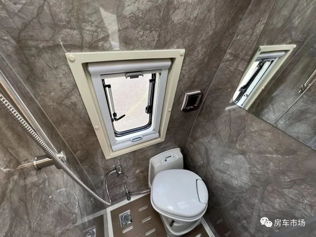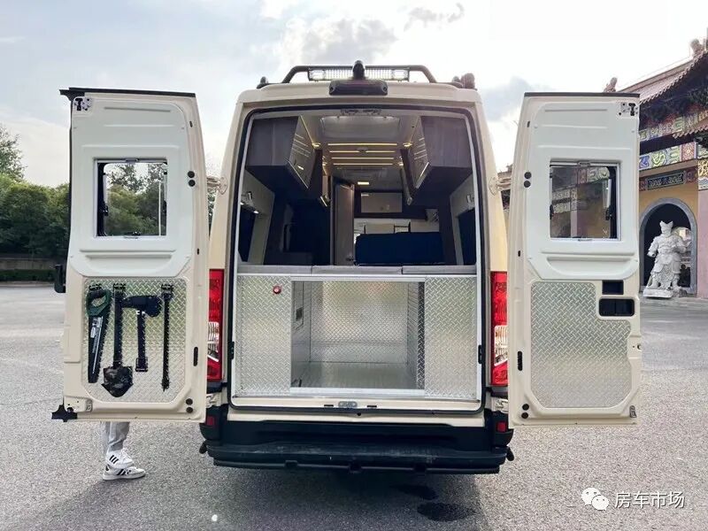 车内的独立卫浴间配有进口盒式马桶、淋浴花洒、外推窗、化妆镜、换气扇等。车尾设计有一张三段式横置大床,尺寸是1850*1250毫米,上部还设计有储物吊柜。尾床的下部为储物仓。尾门可对侧180度打开,空间前后通透,并加装有工兵铲等越野工具。在水电方面,新车配有12V-3000W逆变器、12V-800ah锂电池,150L净水箱、50L灰水箱。