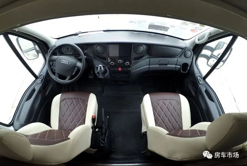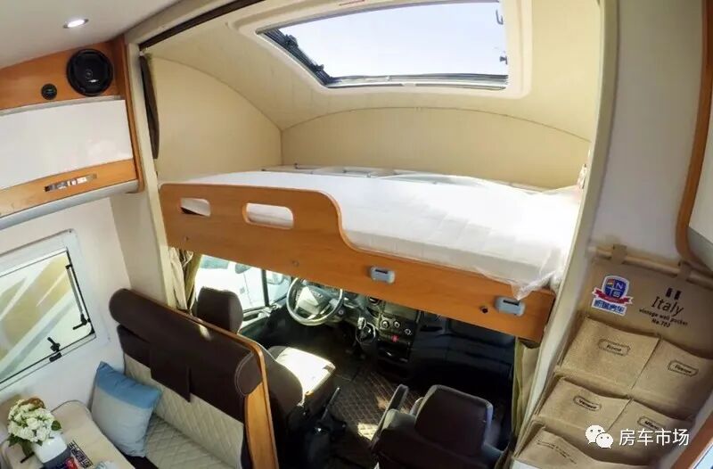 车内采用2+2+2的座椅布局,整车可核载6人。驾驶舱的上部配有一张额头双人大床,尺寸是1900*1350毫米,这也是该车最大的一张床位,顶部配有全景曲面天窗,内部为软包设计且高度合理休息时舒适度高,可通过爬梯上下,额头床的床板采用翻折设计,下部配有内嵌式32寸液晶网络电视。驾驶舱配有多功能方向盘、智能液晶显示屏、倒车雷达、中控GPS+倒车影像一体机等。