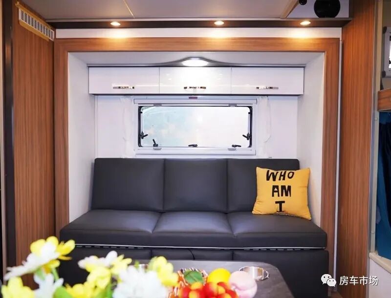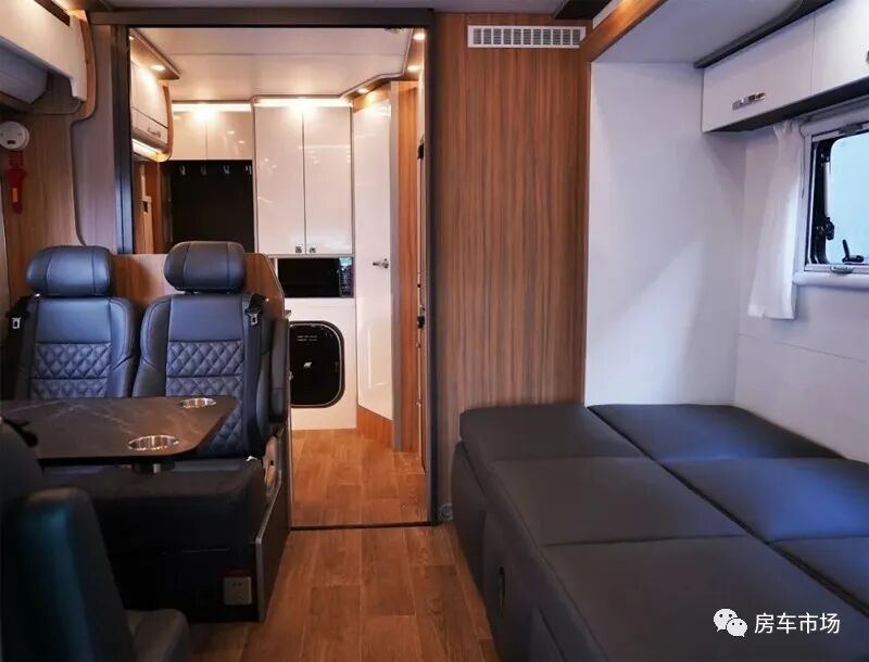 会客区配有更适合长途乘坐的乘用级别汽车座椅,中部是一张升降餐桌,内侧有外推窗,上部是一组吊柜,以及空调。对面是一张3人座皮质大沙发,并配有电动腿托,驻车时能一键电动拼床,尺寸是1.9*1.1米。后部区域与客厅之间配有隔断门,独立的两个区域互不影响。