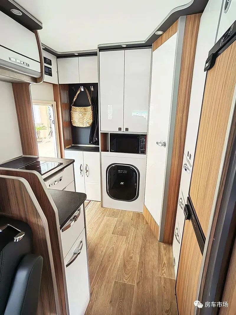 后部区域打造有多功能组合柜,“L型”的厨房料理台,配有带盖的洗菜池+高弯水龙头、152L智能温控冰箱、电磁炉、大风力吸油烟机,微波炉、以及十分丰富的储物空间。车门位置设计有入门玄关,配有鞋柜、衣帽钩、家用尺寸的大衣柜以及一台3公斤洗烘一体机。