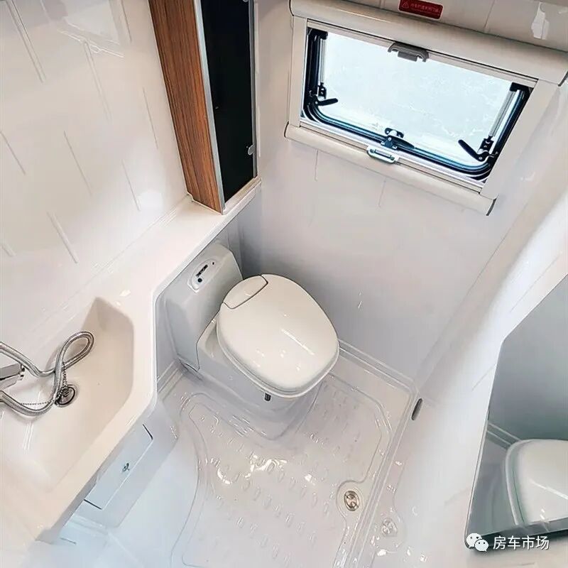 卫浴间采用吸塑式设计,可防霉防潮,容易清洁和擦拭。配有进口盒式马桶、面盆、换装镜、储物柜等,而且该车取消了传统的顶置换气扇而是改为侧风系统。水电储备方面,该车采用24V电路系统,配有3000W逆变器、600ah锂电池(15度电)、1700W太阳能,净水箱300L、70L灰水箱,并配有进口智能水泵带自吸水功能。