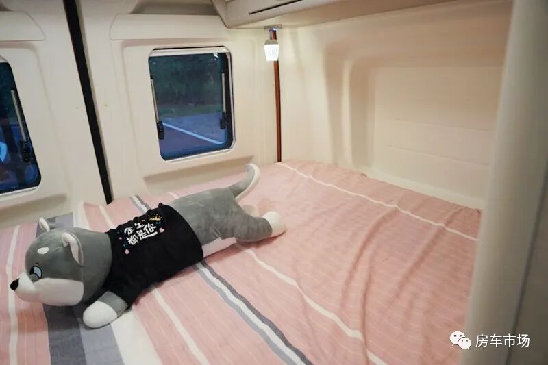 尾部设计有一张横置大床,两侧均开有盲窗可增加尾床的使用面积,尺寸可达到2.05*1.35米,能睡下2个成年人。在床头部位配有阅读灯,车尾门安装有两扇外推窗。