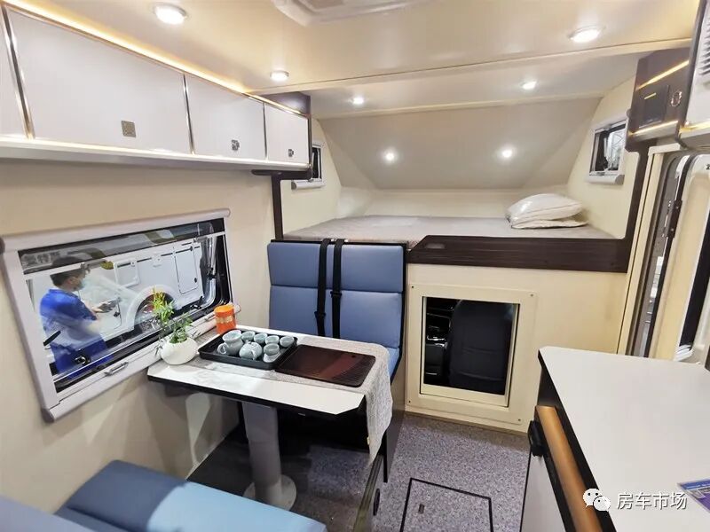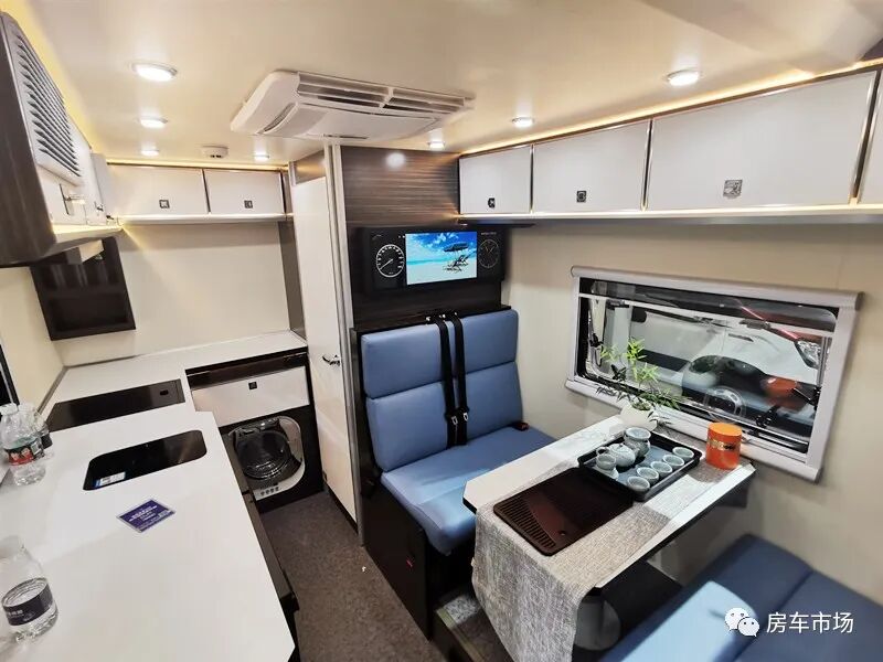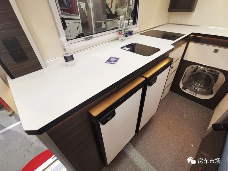 该车采用通仓式设计,驾驶舱与生活区之间设计有通舱器。会客区采用4人对坐式,宽大舒适的皮质沙发标配三点式安全带,中部配有一张气动升降式6向调节桌,可与座椅组合拼床,内侧的开窗保障日常客厅区域的采光和通风。上部还打造有多组吊柜方便储物。对面设计有整体式橱柜,操作台十分宽大,配有可温控的双冰箱、电磁炉、带盖的深水槽以及一台内嵌式车载洗衣机。