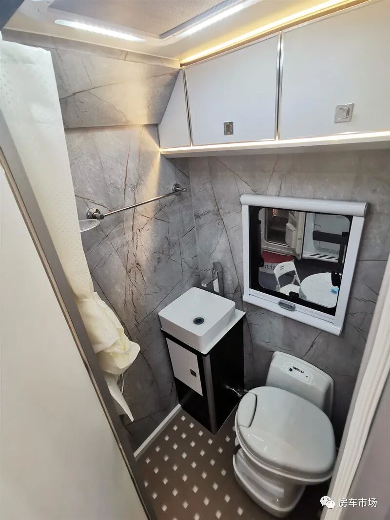 独立的卫浴间位于会客区的后部,配有进口盒式马桶、陶瓷洗手池、毛巾架、外推窗、以及换气扇,地板配有隔水防滑的木板。水电方面,该车标配有180L净水箱以及65L、3000W工频充电逆变一体机,同时该车还配有独立燃油锅炉、进口过水热系统、独立柴油暖风等。