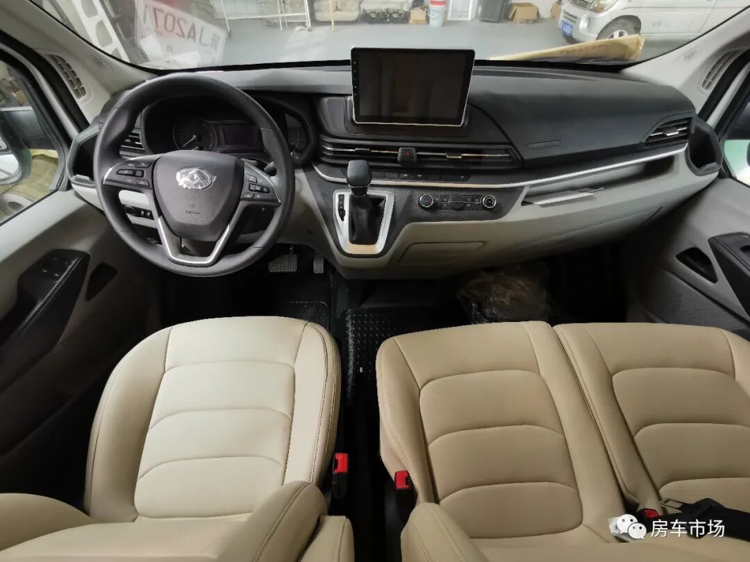 新车采用珠白色外观涂装搭配车身两侧金色拉花,大气简约。大通V90加长轴超高顶底盘改装,整车尺寸:5940*2110*2755毫米,轴距3750毫米,上蓝色牌照C证驾驶。动力上,搭载一台2.0T柴油发动机,匹配6at自动挡变速器,最大功率149匹马力,峰值扭矩375牛米,发动机前置后驱,后置双胎,承载力更强。同时加长轴距的底盘支撑性也更好,行驶稳定安全。满足国六排放标准。