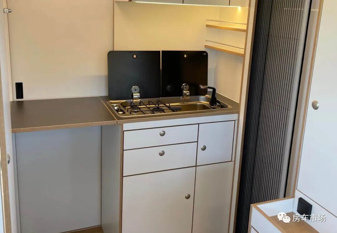 厨房在门口的右侧,可以看到橱柜侧面增加了一个延长板,平时不使用的情况下可以收起,不占用空间。台面上配有燃气灶和洗菜盆,一体式不锈钢材质,清水箱150升,灰水箱80升,都有防冻保护,衣柜旁边是一台80升车载冰箱,其它配置有特鲁玛柴油暖风、11升热水锅炉,160Ah锂电池。