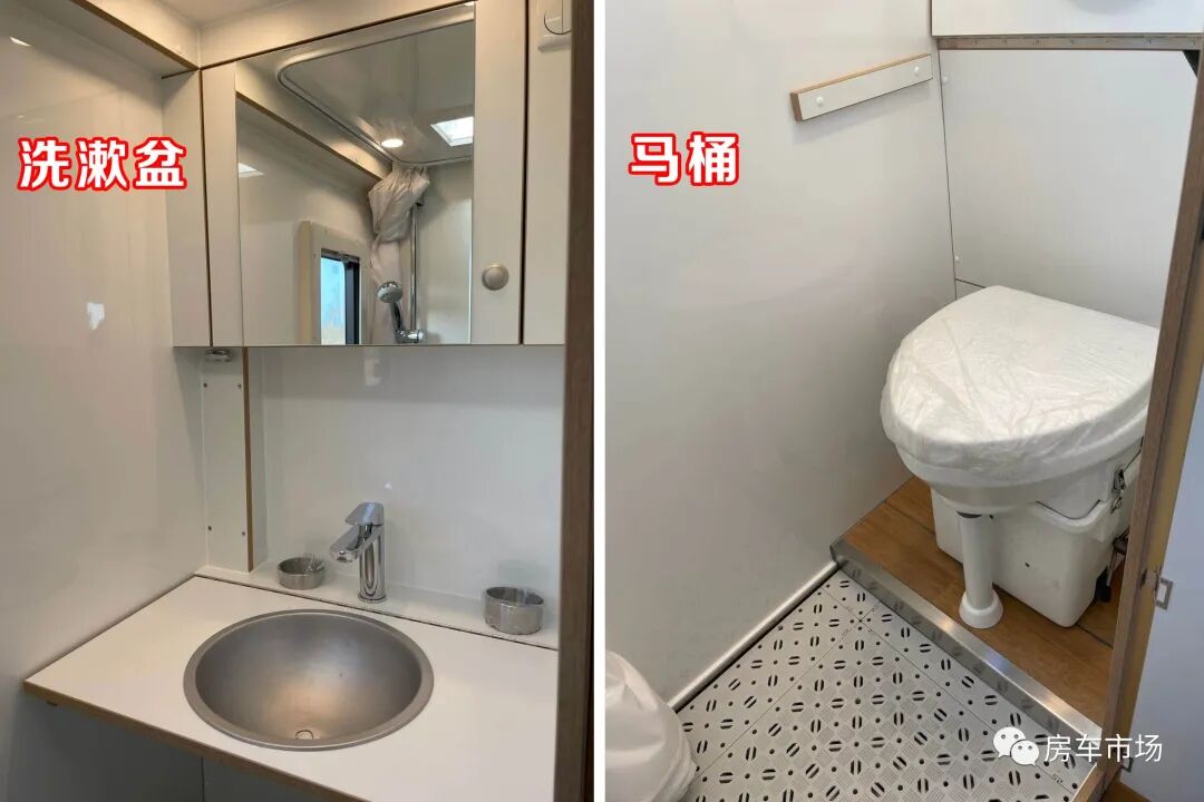 卫生间设有分体式马桶,大小便可以分离,省水易冲洗,马桶上部是翻折式洗漱盆,不占用空间,淋浴间设有淋浴花洒,防滑地板等,车外设有户外淋浴,可随时冲洗。