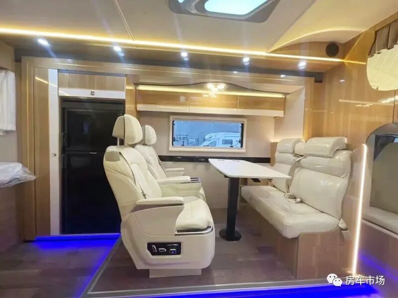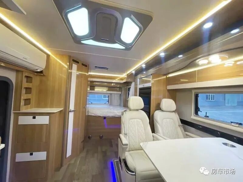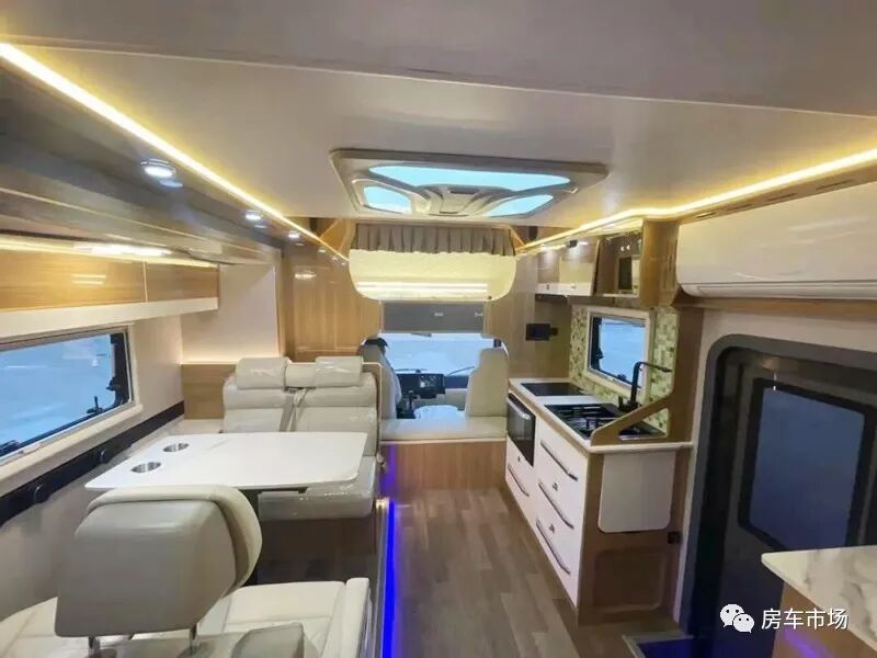 驾驶舱配有多功能方向盘、倒车雷达+倒车影像、定速巡航以及流媒体后视镜等。驾驶舱与后部生活区采用通仓式设计,上部配有一张额头大床,尺寸是2250*1400毫米。驾驶舱后部是该车的大客厅,设计有4人对坐式的会客区,会客区不仅配有传统的双人沙发座椅,还配了更高端的航空座椅,带电动加热以及按摩功能。内侧有外推窗,顶部有储物吊柜,后部设计有内嵌式118L双开门冰箱。