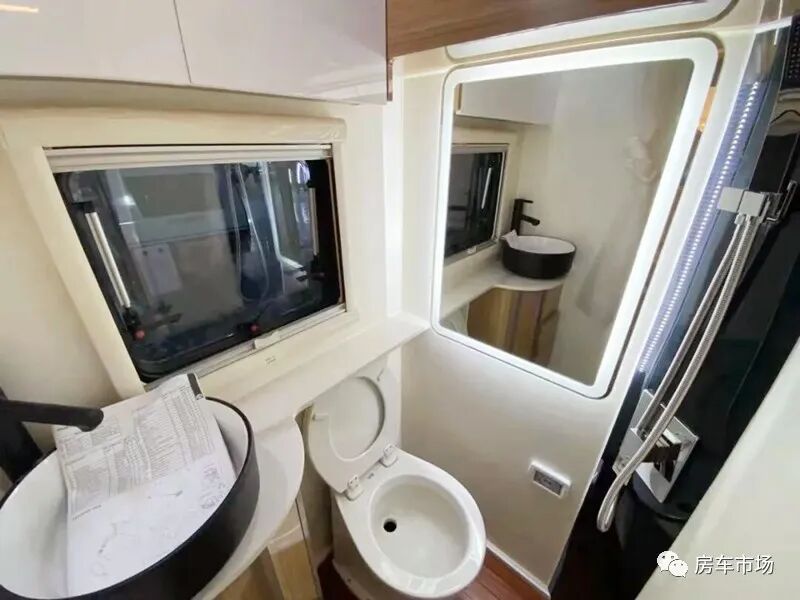 会客区的对面是厨房的操作台,配有电磁炉、下沉式水池+高弯水龙头、吸油烟机等,同时在橱柜的上部以及下部还设计有非常丰富的储物空间。在车门的上部配有一台驻车空调,并在上车门的位置配了鞋柜。车内打造有独立卫浴间配有陶瓷面盆+水龙头、马桶、化妆镜、外推窗以及独立淋浴花洒等,该车还配了洗衣机方便旅行中清洗衣物。