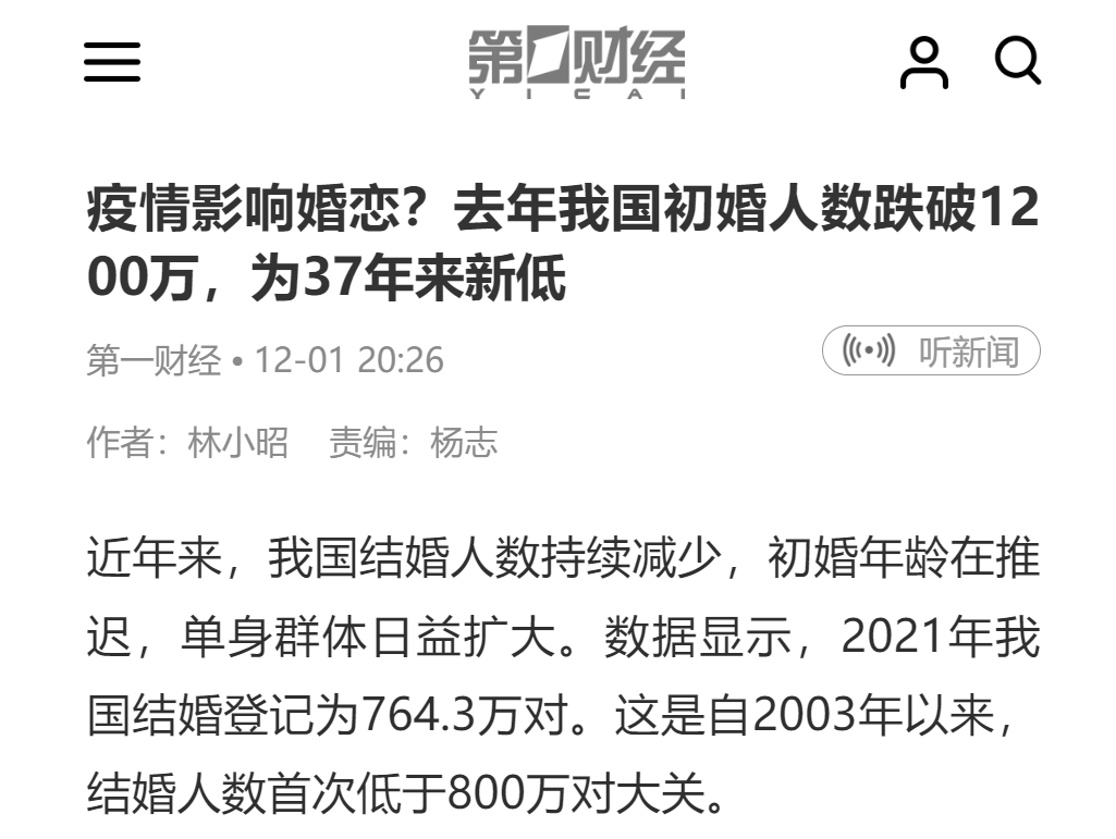 2021 年我国初婚人数跌破 1200 万,为 37 年来新低,年轻人的婚结的越来越晚,也越来越不爱结婚了。