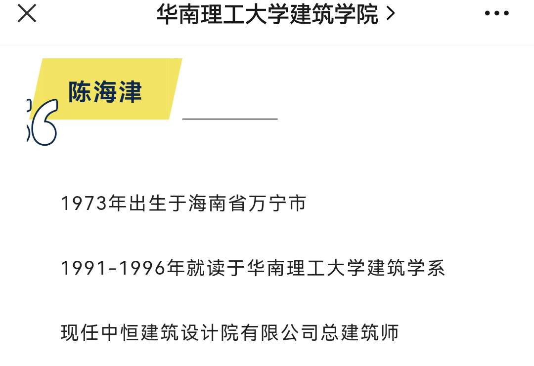 陈海津,中恒建筑设计院有限公司总建筑师,毕业于华南理工大学建筑学系,不是同名同姓,是华南理工大学建筑学院官宣的哈。