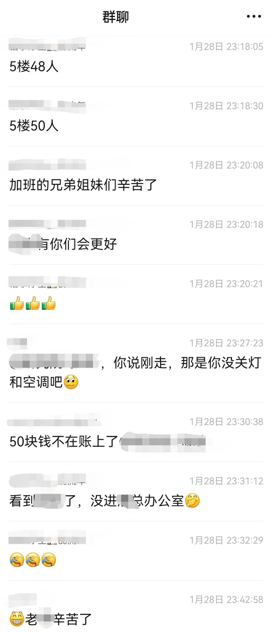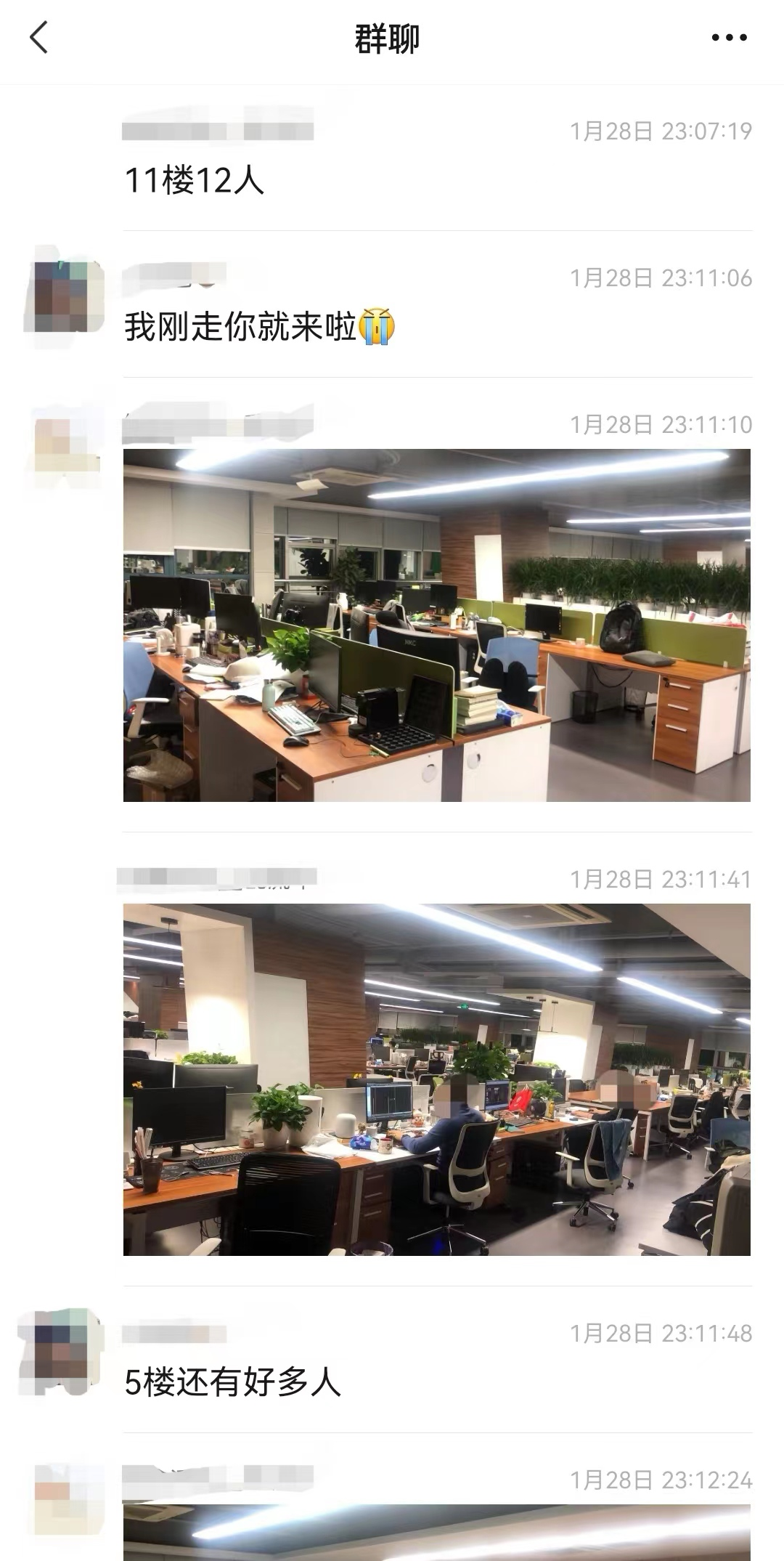 晚上11点,人事部门的工作人员到各个楼层点卯并在群聊中汇报各层加班人数,没有加班的第二天会被通报批评。