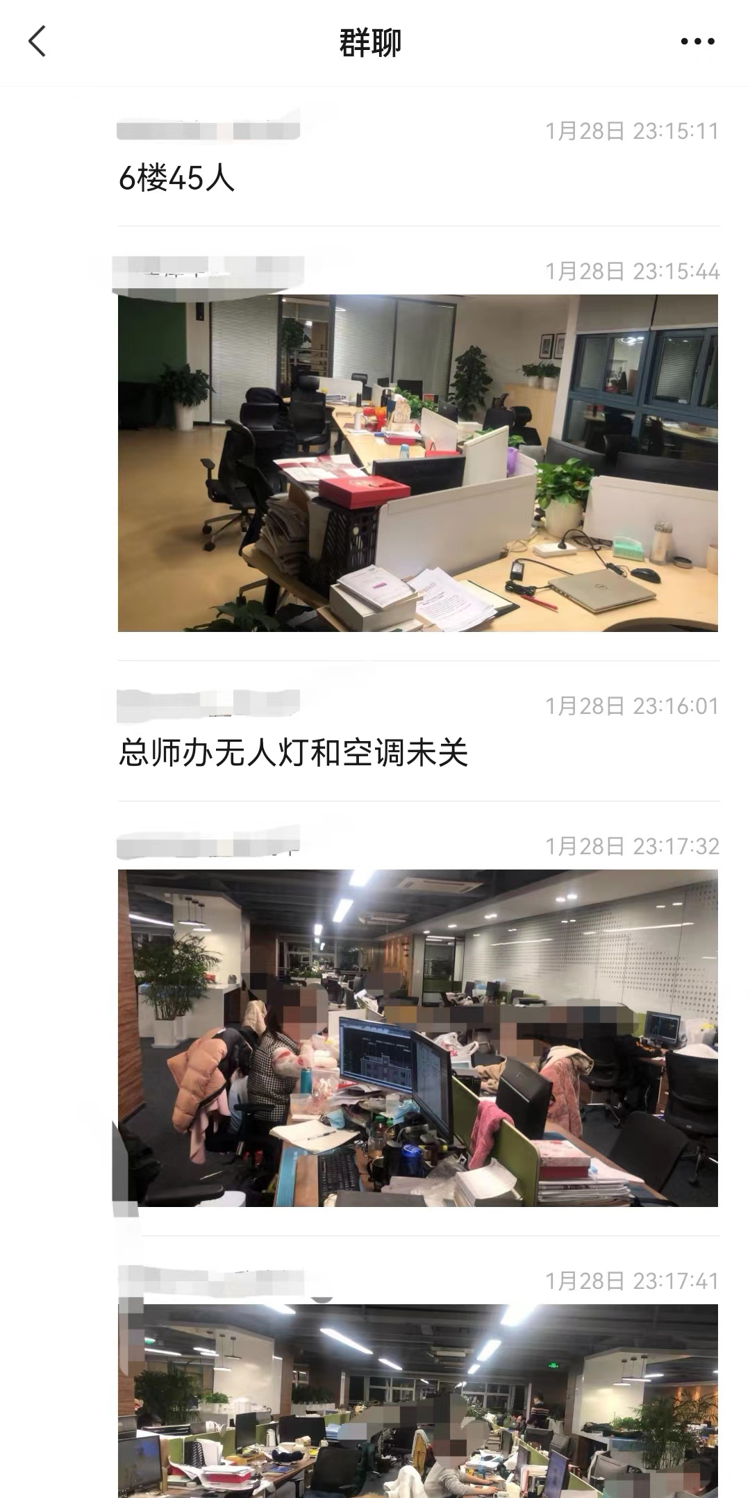 这张截图中提到了总师办无人,灯和空调未关,并不是好心提醒,而是会罚钱。