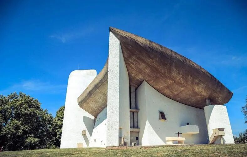 一个是朗香教堂,我们在其上已然看不出激进时期柯布”机器美学“的影子,也与柯布所谓竖个“Im monument” 的牌子就算纪念碑的想法相去甚远,似乎是柯布用现代主义美学寻回“神性空间”的尝试。