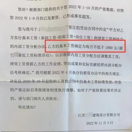 这位读者签订劳动合同的时间比昨天那位还早上几年,因为签订时就是按照当年CZ市最低工资标准定的基本工资,所以降薪通知上写的是不低于1890元每月的基本工资发放(随CZ最低工资标准发放)