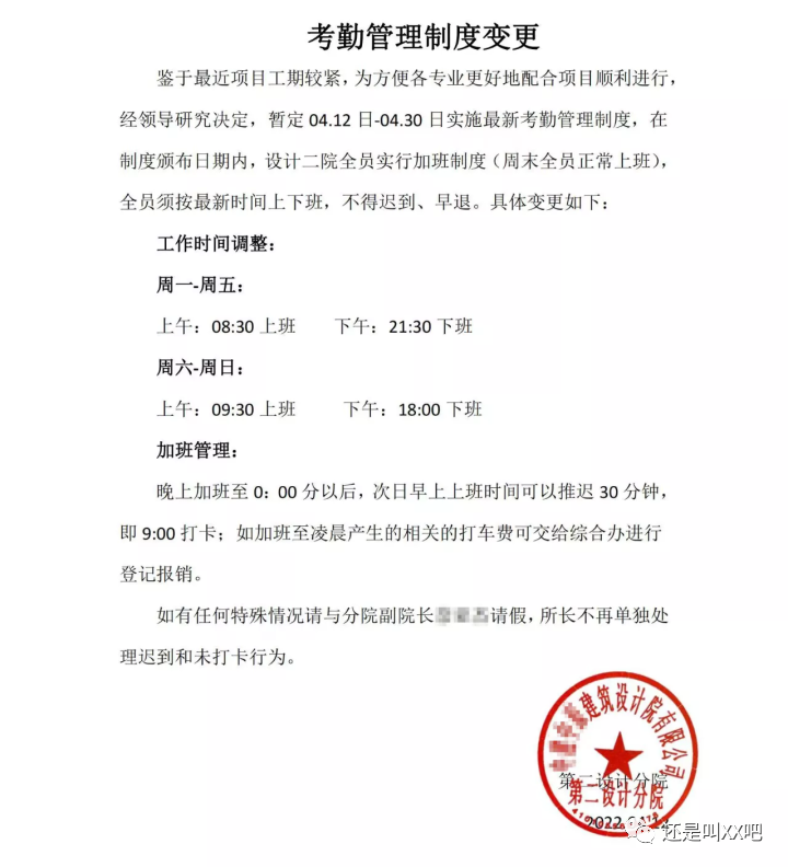据不可靠消息来源,这是一家位于河南地区的建筑设计院,按照其下发的文件要求,在4月12日至4月30日期间,全员必须实行早8晚9的工作制度,没有休息日。