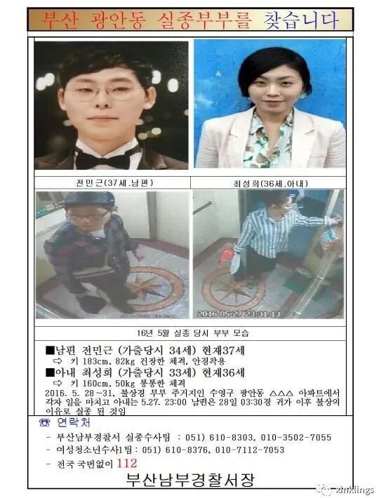 2016年5月31日,釜山警方接到一位全姓男士报案,报案人称联系不上儿子和儿媳,去儿子开的餐厅里也找过,实在不知道两个孩子去了哪里。警方了解情况后,跟着全先生去了他儿子儿媳住的公寓调查,这是一幢16层的老式公寓,全先生的儿子儿媳住在15层。警察先敲门没有回应,征得全先生同意后,撬开了房门,一只活泼的小狗出来迎接他们,家中满地都是狗屎,水槽里有几只碗没有洗,一些装在超市购物袋里的食物摆在料理台上,此外没有外人强迫进入或打斗的痕迹。