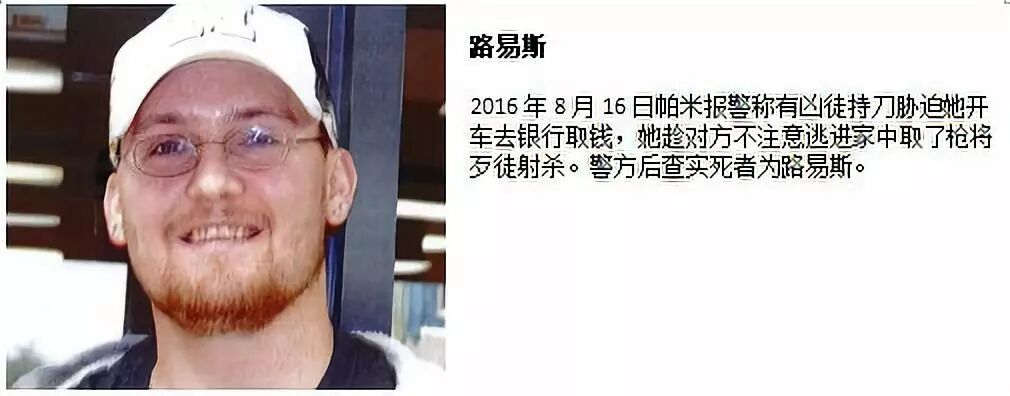33岁的路易斯也是密苏里本地人,自22岁遭遇车祸后大脑和行动能力皆受到损伤。2016年8月16日,911接到帕米的报警电话,称一名男子持刀跳出由他人驾驶的车外直冲向帕米家门前,威胁正坐在车里的帕米,要求她载自己去银行取“洛斯的钱”。随后接线员听到跑动的声音和数声枪响。急救人员赶到帕米家时这名男子已经中枪不治,帕米告诉警方她称对方不注意得以逃回家取枪自卫。