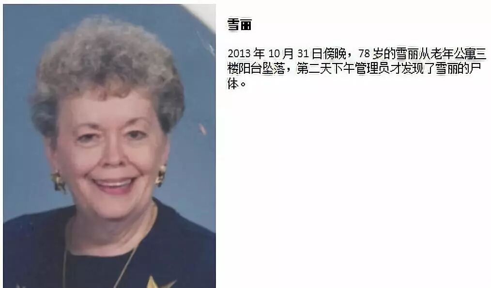 雪丽是帕米的母亲,2000年丧夫后独自生活。2013年78岁的雪丽住在老年公寓,患有失智症及关节炎。10月29日帕米带母亲去医院检查,第二天晚上5点帕米把雪丽送回老年公寓,临走时告诉管理人员雪丽当晚不需要晚餐,次日也不吃早餐。10月31日下午2:30管理人员发现了摔落下阳台的雪丽的尸体。雪丽居住的三楼阳台铝制栏杆损坏。尸检在雪丽体内发现了.84毫克镇静剂,超出正常药量八倍。