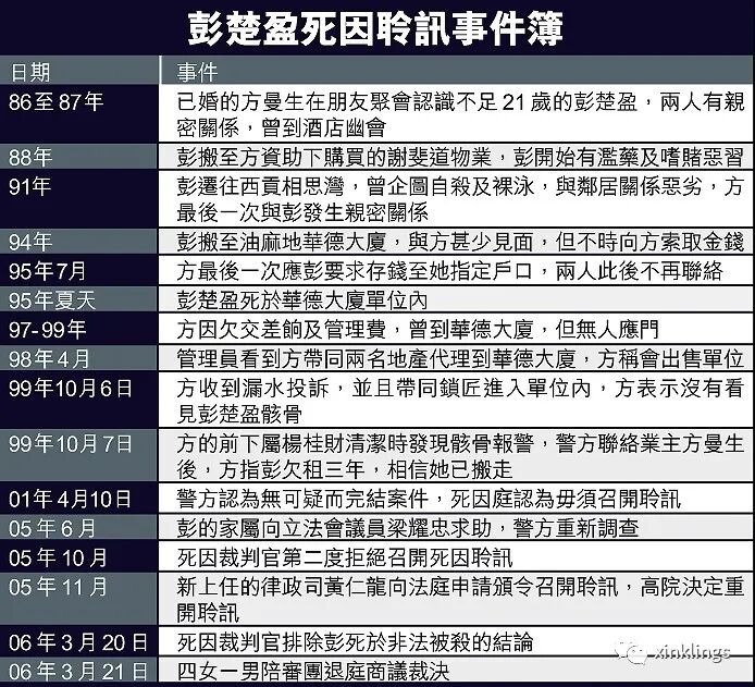 1999年彭楚盈陈尸华德大厦,警方以“死因不明”结案,那时方曼生的大妹陈方安生在任政务司司长。多年来,彭楚盈的家人无法接受这一结果,四处奔走,还找到律师翁静晶帮忙。警方数次拒绝召开死因研讯,直到2005年,彭楚盈过世十年,新上任的律政司司长亲自介入,向法庭申请下令就彭楚盈的死因进行聆讯。