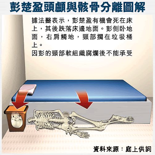 法医出庭指出找到彭楚盈骸骨的现场没有血迹,亦没有任何打斗痕迹。彭楚盈的尸骨上没有伤痕,至于位于她胸腔部位之下的地毯呈深褐色,则有多种可能性,包括内出血,呕吐及咳嗽等。法医表示彭楚盈可能死于床上,也可能死于发现骸骨的地面,在她的尸体开始腐化后,由于连接头颈与身体的软组织分解,无法负担头颅重量,导致头颅跌入靠近床头放置的垃圾桶内。