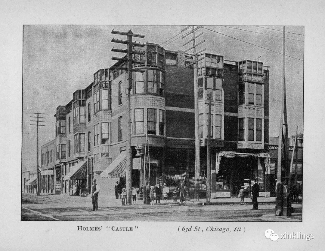 HH福尔摩斯逃到另外一个区,在药店老老实实做起了学徒。几年后他把药店买下,又在街对面建了地上三层,地下一层的巨大建筑:一层是隔成小间的商店,三层是公寓,二层归HH福尔摩斯使用。把药店卖给他的老板在收到钱款前神秘失踪。这座建筑物位于63街和华莱士街夹角,占据了整整一个街区。