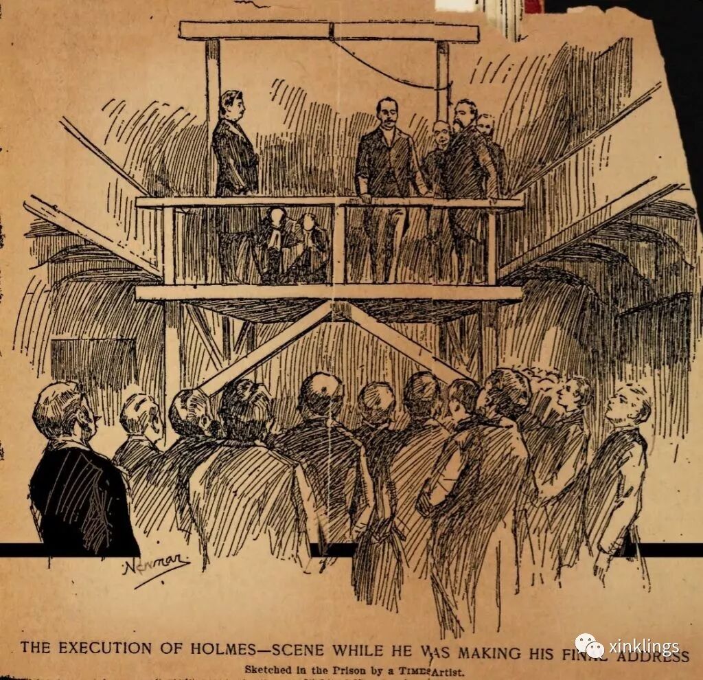 1895年万圣节前对HH福尔摩斯的审判开庭。HH福尔摩斯在庭上说:“我生来就是个魔鬼。就和诗人无法控制创作的欲望一样,我也没办法控制自己杀人。”庭审持续六天,HH福尔摩斯被判有罪,死刑。1896年5月7日,HH福尔摩斯被执行绞刑。