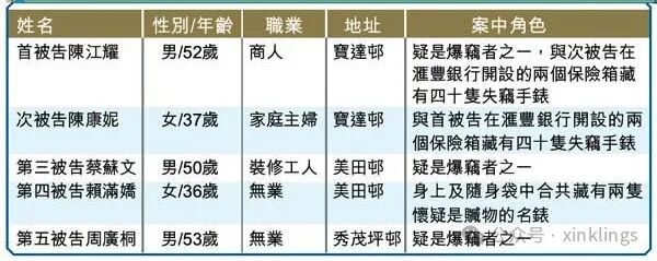陈江耀,52岁,自称是经营内地云石生意的商人,陈康妮,37岁,家庭主妇,蔡苏文50岁,装修工人,赖满娇36岁,无业,蔡赖两人都持双程证在港居住,周广桐,53岁,无业。1986年至1997年间,陈江耀共有六项入室行窃的定罪,蔡苏文的十二项定罪中,七项为盗窃罪名,周广桐的十项定罪中,有一项涉及盗窃,一项涉及处理赃物。