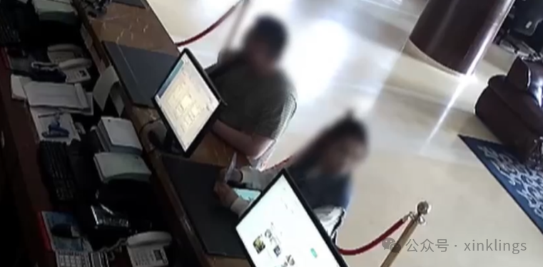 (由上至下分别是薛乙宝登记入住,进入房间,王丁随后来到,按微信指示拿房卡)