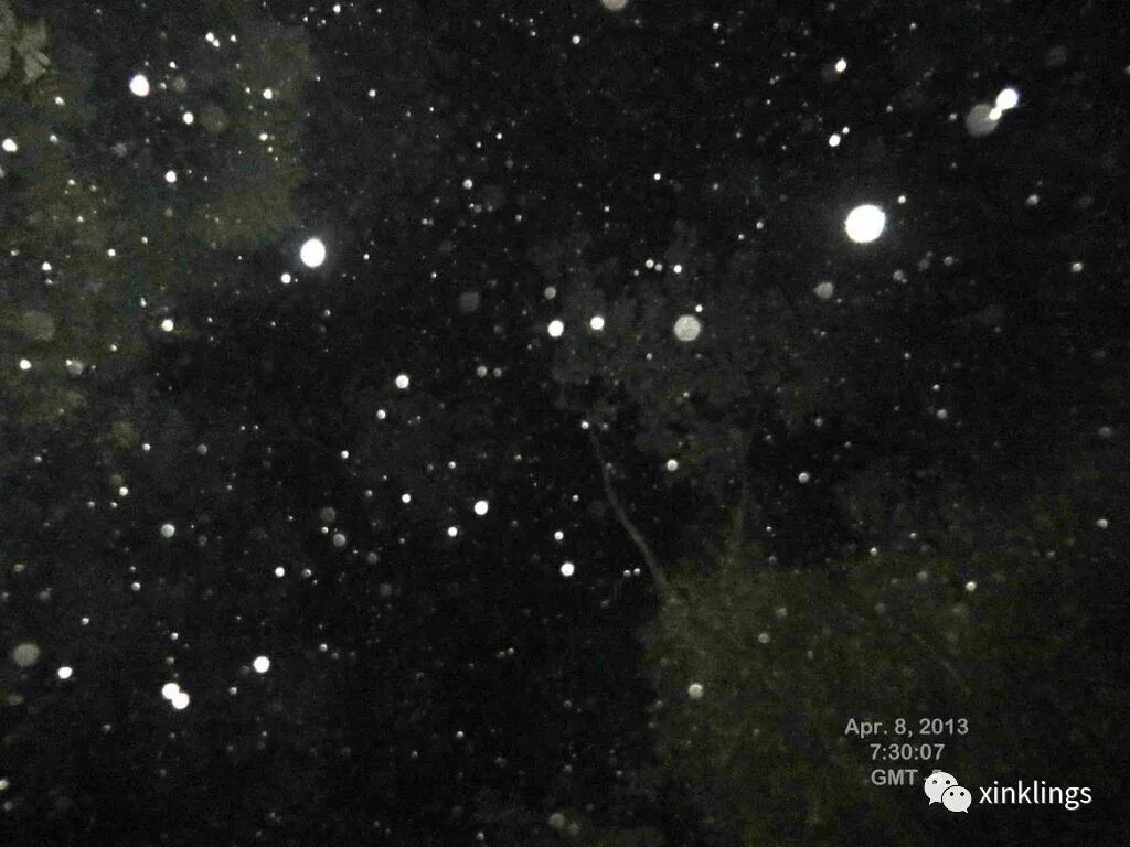 4月8日是栗山和克莉丝失踪的第七天,距离上一张照片(508号)已经过了六天多,栗山的手机电量耗尽,而克莉丝的手机最近一次开关机也是两天前的事了。4月8日相机的100张照片拍摄时间从凌晨1:29延续至4:10,最后一张照片编号609。大部分照片都拍摄了周边环境,仅有极少数照片出现了人或物品。而大部分周边环境的照片里,都出现了如下照片的白色光点。业余侦探推测这些白色光点是雨滴,拍摄者对着天空按下快门。