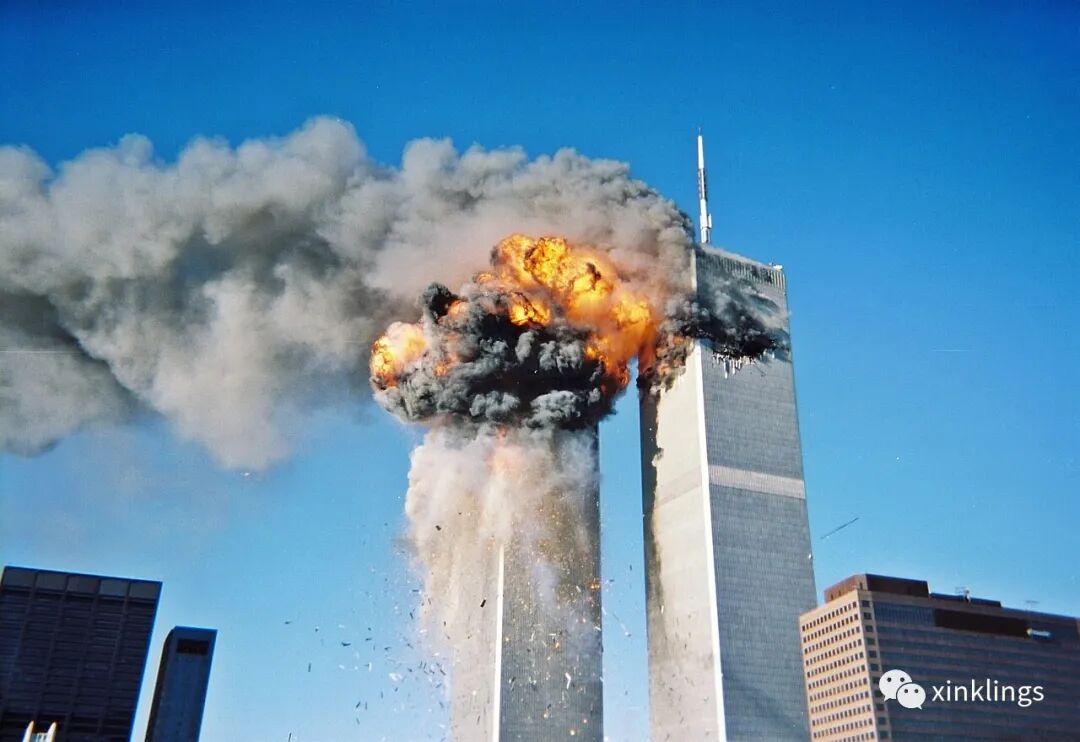 8:46,美国航空11号航班撞上世贸中心北塔;9:03,联合航空175号航班撞上世贸中心南塔。