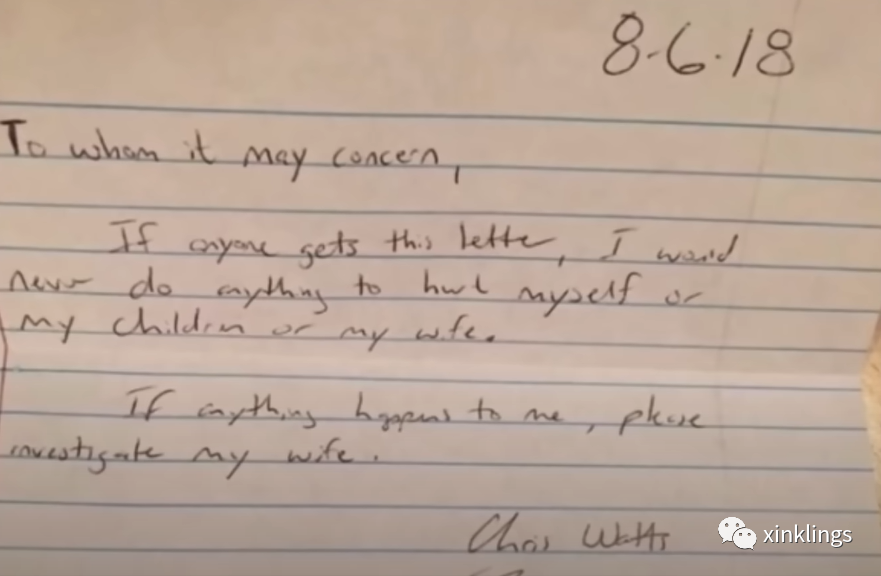 讽刺的是,两周后克里斯给一名女笔友写信,讲述了他罪行的又一个版本。在这个版本里,克里斯对珊楠的死蓄谋已有几周之久,每次珊楠唠叨或是两人闹不愉快,克里斯保持沉默,心里幻想着杀死她的美好感受。8月6日他手写了一封信:“如果有人看到这封信,我绝对不会伤害自己,我的孩子或妻子。如果我发生不测,请调查我的妻子。”