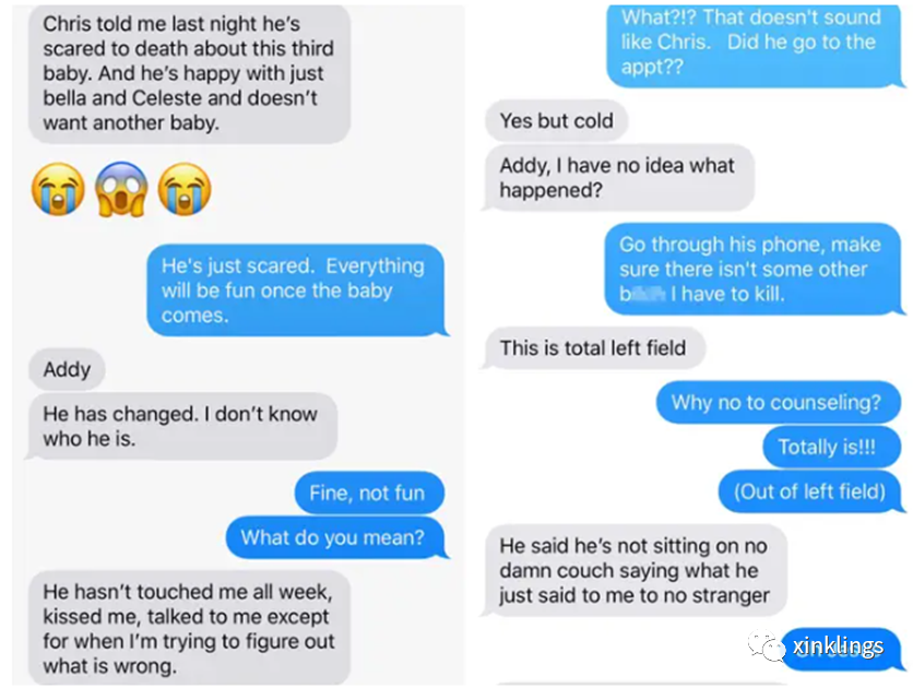 7月31日克里斯飞去北卡,珊楠和他因克里斯父母闹了别扭,珊楠没有直接说,而是通过短信向克里斯抱怨。8月4日凌晨,珊楠给克里斯传了长短信,再次提起开心果冰淇淋的事件。珊楠早前带两个孩子去看克里斯的父母,茜茜坚果过敏,可是克里斯的母亲辛迪却给茜茜吃开心果冰淇淋。茜茜马上有了过敏反应,珊楠气极朝辛迪大喊大叫,辛迪认为珊楠小题大做,干脆把她从自家赶走。这条短信里,珊楠还写道: “从我走那天起,你就没有主动说过想我。你变了。也许你一个人过得更开心,那也没关系。你可以独自一人!我这次怀孕你有意忽略,也不在意我的感受。”