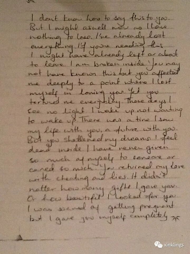 “你原来许诺说等我们交往满一周年就订婚。你想要的只有聚会,你的女人们和你自私自利的小算盘。我曾想要的所有就是你和快乐,但你把他们夺走。为你花钱我甘之如饴,可是你却在我哭泣时狠狠羞辱我。这个世界上已没有让我活下去的意义了。我希望你也像我爱你那样爱过我。我曾梦想过我们俩的未来,梦想过我们的成功。我得到的只有破碎的梦和你虚无缥缈的承诺。现在我就想沉沉睡去再也不要醒来。我一无所有可我曾拥有一切。即使和你在一起我仍感到孤独无比。你让我陷入孤单和脆弱的境地,我本不至于此。”