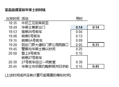 警方派出两名年轻警员复盘华莱士出门乘车的路线,即使不计入等车浪费的时间,华莱士走到26号街车车站至少耗费4分钟,26号街车驶到5号街车.车站至少耗费13分钟。基本上可以确定18:49至20:45之间,华莱士都不在家,不可能犯案。