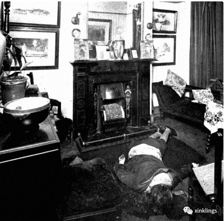 茱莉亚躺在前厅的煤气壁炉前的地上,浑身都是被殴打的伤痕,头骨裂开,血液甚至喷溅到七尺高的墙面。她身下压着一件部分被烧焦的Macintosh品牌大衣。