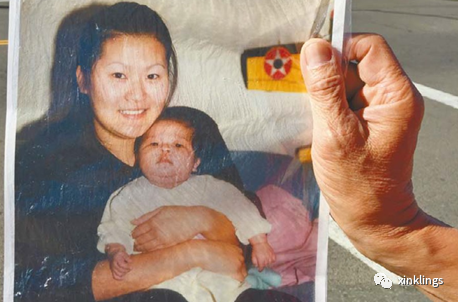 (冼豫华带女儿抱着外孙的照片参加庭审)
