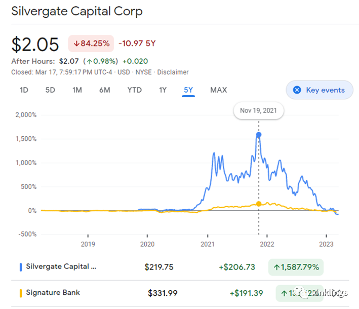 2019年底SG银行上市,至2021年11月股价从发行价每股$12美元飙升到$207美元,涨幅高达1,587.8%。但自那之后股价大幅下挫达97%之巨,在2023年3月8日银行发出结束营业消息时仅值不到$5美元。