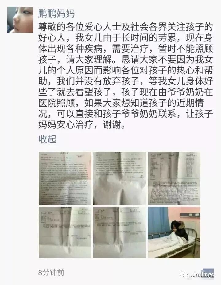 这次的奔波后,宇晨的情况更差,发了高烧,西安市儿童医院诊断宇晨患有支气管炎并间质性肺炎,心肌损害,肝功能异常,脑损伤并脑软化并脑萎缩。玻璃体陈旧性出血伴视网膜内界膜部分脱离,肋骨陈旧性骨折。准备眼部手术前的会诊结果表示,宇晨的双眼视网膜都没有脱离,视力受损还是视神经部分损坏的原因,需要训练脑部来慢慢恢复。