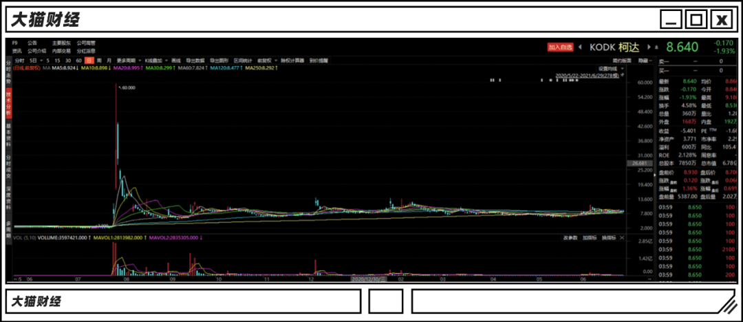 但是,如果追高或者不止盈,那也是典型的“杨白劳”。像柯达,暴涨完之后暴跌,然后一路阴跌,继续低迷到现在。